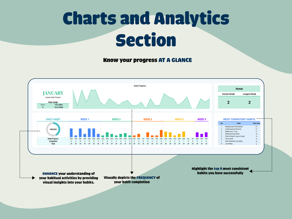 - Auto Calculation (Daily and Weekly): The Habit Progress pie chart is auto-updated by the checkboxes you mark for completed days, providing a visual representation of your weekly habits.