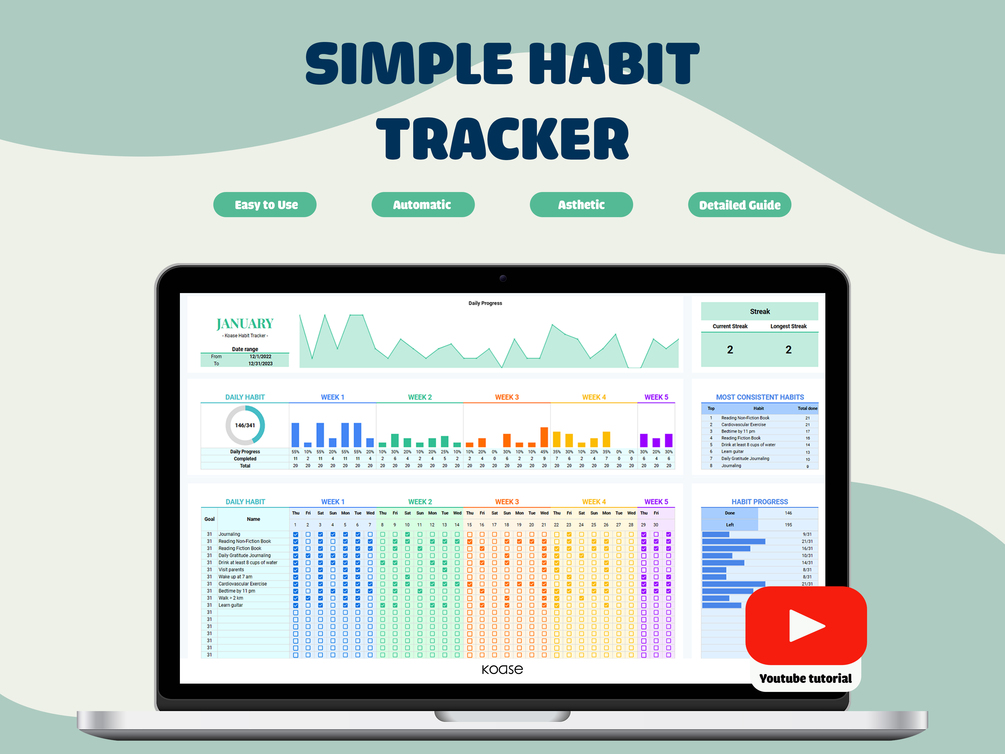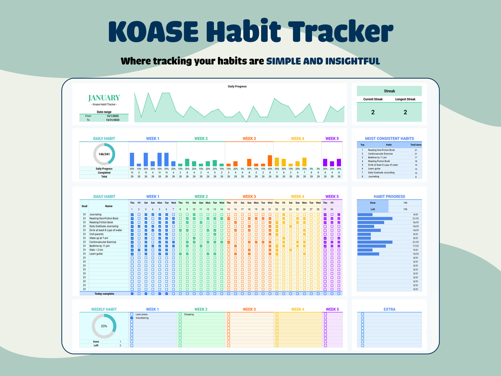 Embark on your journey to building and sustaining positive habits with our Simple Habit Tracker for Google Sheets—a powerful tool designed for habit enthusiasts and those dedicated to personal development. This all-in-one template streamlines habit tracking and provides valuable insights to boost your consistency and motivation.